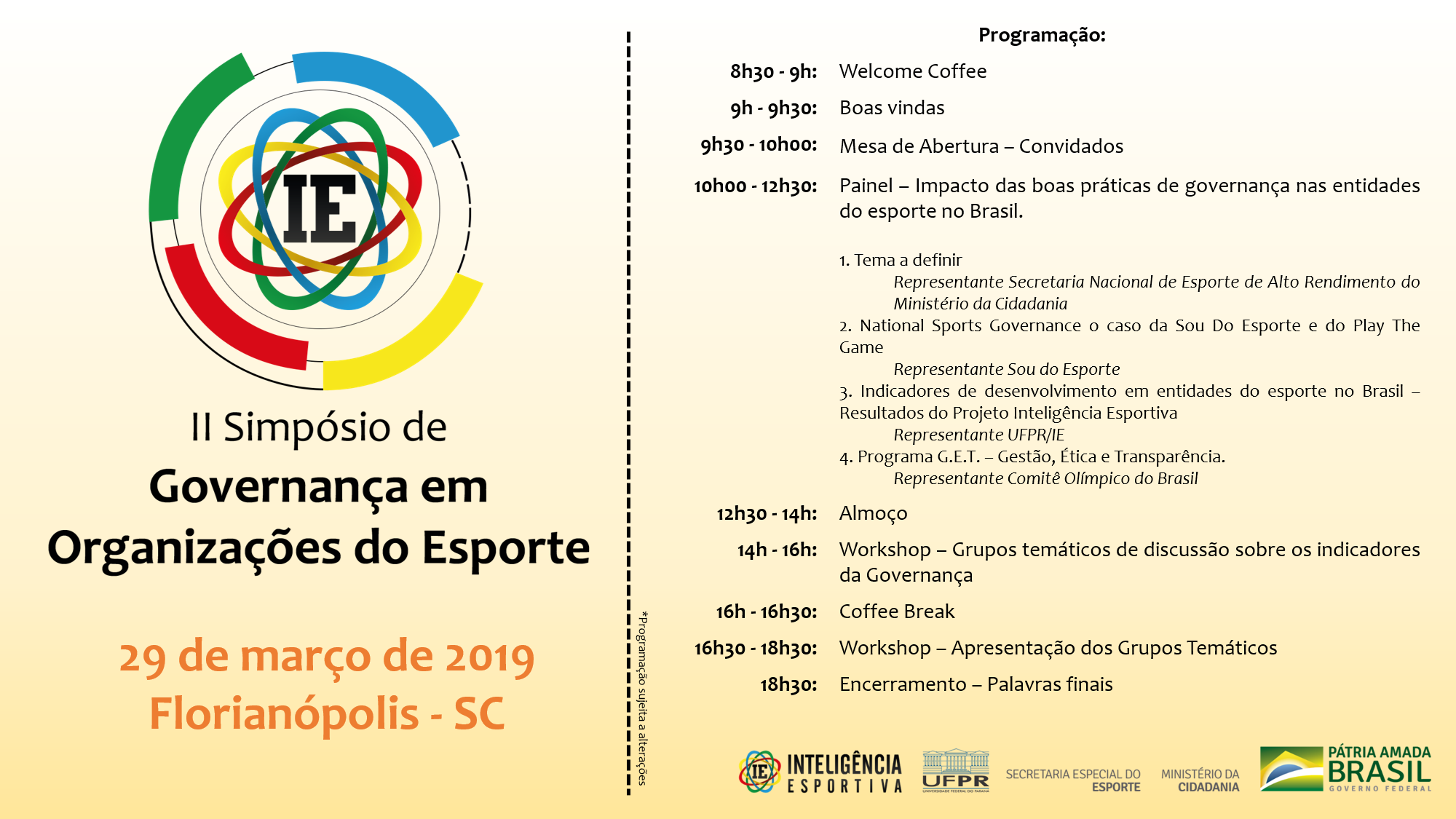 simposio governançaFlorianópolis recebe, no dia 29 de março, o II Simpósio de Governança em Organizações do Esporte, organizado pelo Instituto de Pesquisa Inteligência Esportiva da Universidade Federal do Paraná. Com o objetivo de aprofundar o conhecimento e capacitar tecnicamente os gestores esportivos com as melhores ferramentas de governança no esporte desenvolvidas, aplicadas e reconhecidas nacionalmente e internacionalmente, o evento será realizado no Auditório do Centro de Ciências da Saúde e do Esporte da Universidade do Estado de Santa Catarina (CEFID/UDESC), em Florianópolis (R. Pascoal Simone, 358 – Coqueiros). As inscrições são gratuitas e limitadas e devem ser feitas pelo e-mail: inteligenciaesportiva@gmail.com.