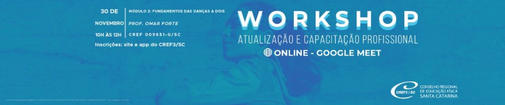 Venha saber mais sobre a prática das danças a dois, repertório básico, uma breve história do gênero bolero e vertentes e fundamentos aplicados no módulo II do curso “Fundamentos das danças a dois”, que será ministrado Prof. Omar Forte (CREF 009651-G/SC), no Workshop de Atualização Online, dia 30/11, das 10h às 12h, na Plataforma Google Meet.