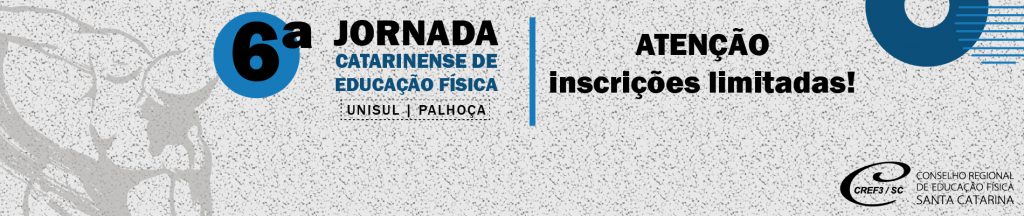 Está chegando a hora de nos encontrarmos na 6ª Jornada Catarinense de Educação Física, que acontece nos dias 2 e 3 de setembro, na Unisul Pedra Branca. Fique atento, pois as vagas são limitadas! Serão 20 cursos no maior encontro promovido pelo Conselho em Santa Catarina. Vem com a gente atualizar seus conhecimentos em dois dias intensos de muito aprendizado, com temas pensados especialmente para os profissionais e acadêmicos da área.