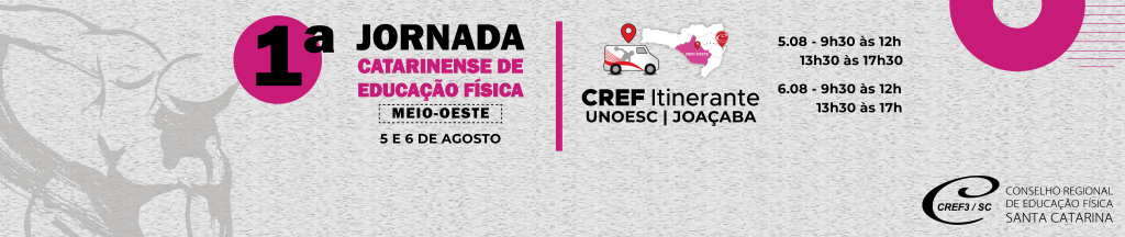 Já estão abertas as inscrições para a 1ª Jornada Catarinense de Educação Física da Região Meio-Oeste, que será realizada nos dias 5 e 6 de agosto, na Unoesc Joaçaba. Com os temas “Inovação na Educação Física a partir de jogos Lúdicos para Crianças”, ministrado pelo prof. Dr. Prof. Me. Roberto Mafli (CREF 001957-G/SC) e “Personal Training – Presencial e Digital da Gestão ao Treinamento”, ministrado pelo prof. Dr. André Fernandes (CREF 000013-G/RJ).