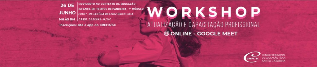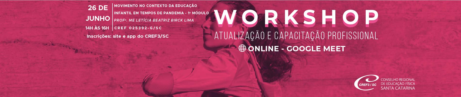 “Movimento no contexto da Educação Infantil (em tempos de Pandemia)”, é o tema do Workshop de Atualização e Capacitação Profissional online, que acontece no dia 26 de junho, ministrado pelo prof Me Leticia Beatriz Birck Lima (CREF 025392-G/SC). O curso, que tem como objetivo orientar o planejamento e o desenvolvimento de práticas pedagógicas relacionadas ao movimento na Educação Infantil, especialmente aqueles utilizados pelas crianças em tempos de pandemia, será realizado na Plataforma Google Meet, das 14h às 16hs. Este será o módulo 1 do curso, no dia 3 de julho será realizado o módulo 2, na mesma plataforma.