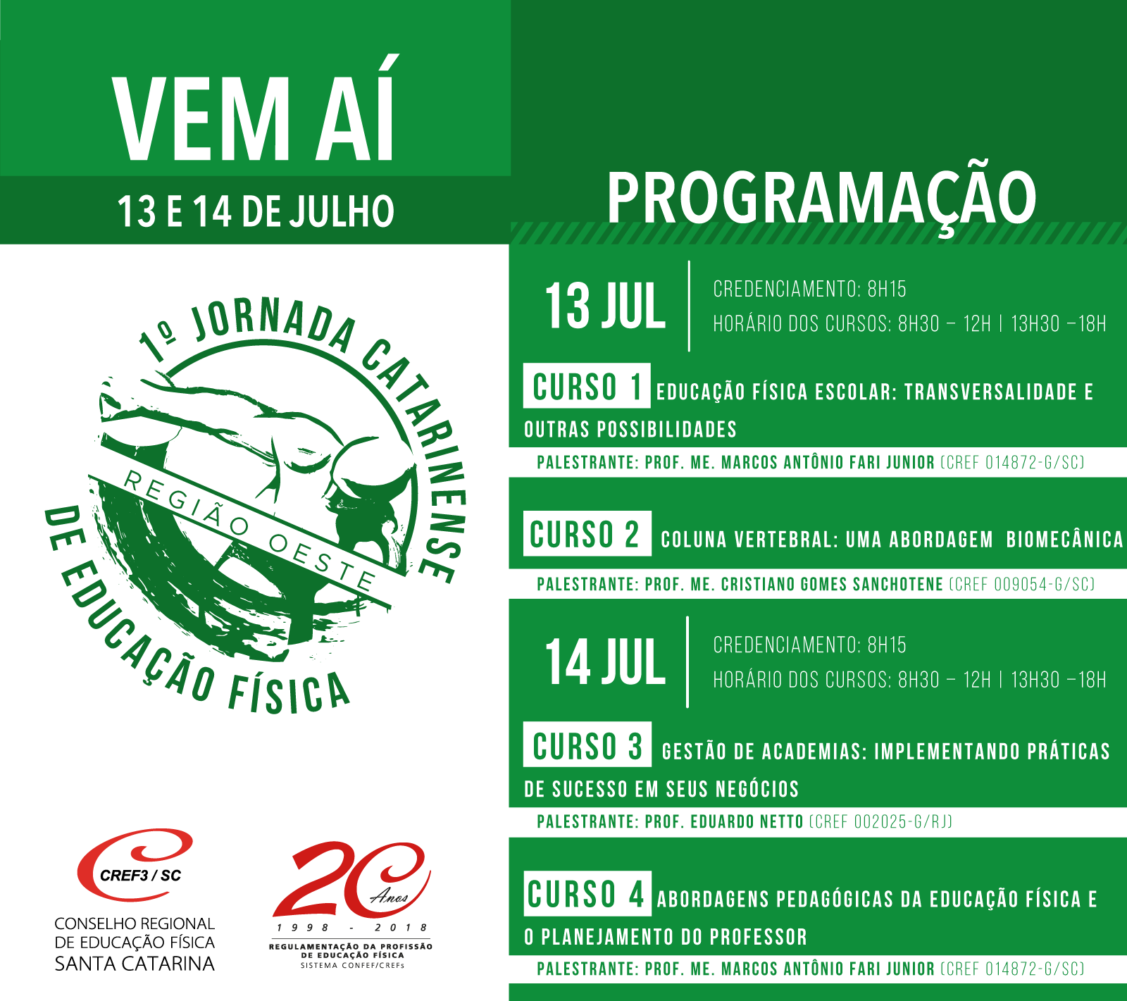 Com quatro cursos nas áreas de gestão, Educação Física Escolar e prevenção da saúde, a 1ª Jornada Catarinense de Educação Física da Região Oeste, pretende reunir profissionais e acadêmicos de Educação Física para debater a profissão nos dias 13 e 14 de julho, na Unoesc, em Chapecó. Já escolheu o curso? Confira a programação e faça a inscrição gratuita para profissionais de Educação Física e acadêmicos.