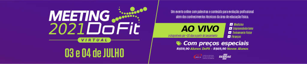 Banner siteA DoFit, em parceria com o CREF3/SC, sorteará 10 inscrições para profissionais registrados no CREF3/SC para participar do Meeting DoFit 2021, que acontecerá nos dias 03 e 04 de julho, de forma 100% virtual. Para participar do sorteio, basta preencher o formulário e acompanhar o Instagram @DoFitBR, onde será divulgado o resultado no dia 24 de junho.