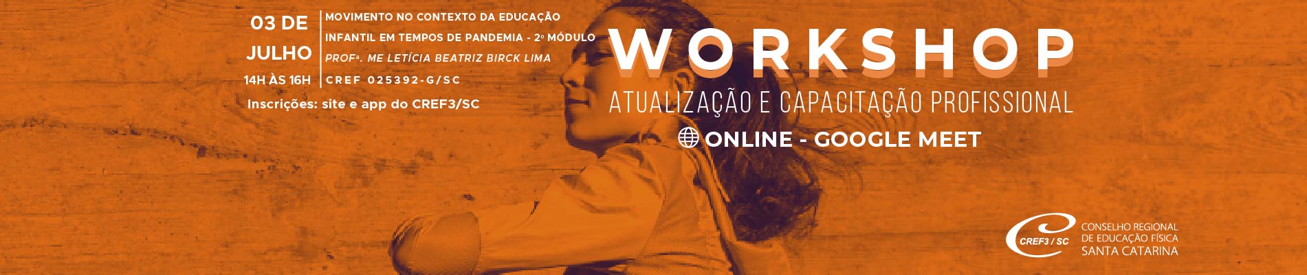 Neste sábado, 3 de julho, acontece o módulo 2 do Workshop de Atualização Online com o tema “Movimento no contexto da Educação Infantil (em tempos de Pandemia)”, ministrado pela profa. Me. Leticia Beatriz Birck Lima (CREF 025392-G/SC). O curso será realizado na Plataforma Google Meet, das 14h às 16hs e vai abordar temas como o planejamento e o desenvolvimento de práticas pedagógicas relacionadas ao movimento na Educação Infantil, especialmente aqueles utilizados pelas crianças em tempos de pandemia. Não perca!