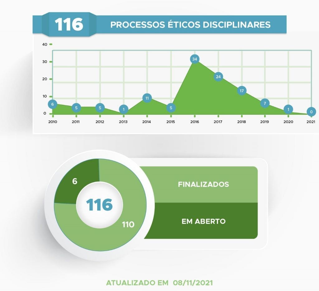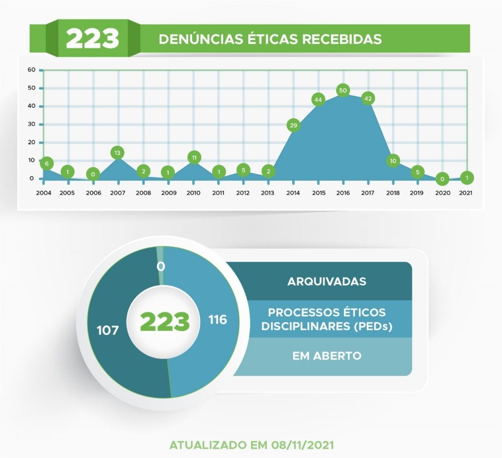 No período, 223 Denúncias Éticas foram recebidas e analisadas pela Câmara. Do total, 116 se tornaram Processos Éticos Disciplinares (PED), dos quais, 110 foram finalizados.