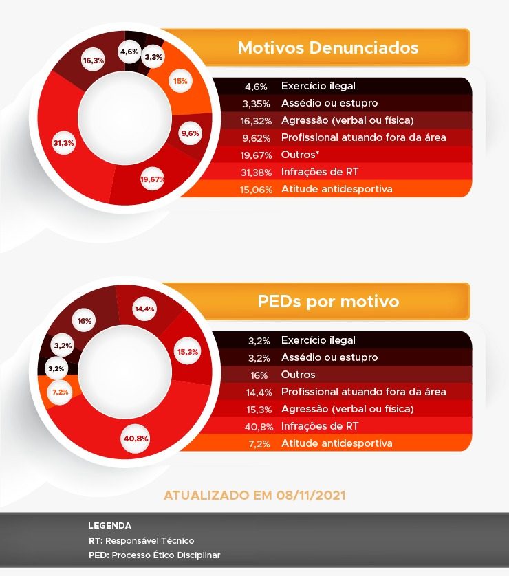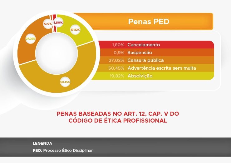 Entre os motivos das denúncias, o mais recorrente é a Infração de RT (31,38% dos casos de denúncia e 40,8% dos PEDs). As penas aplicadas no caso de julgamento, como cancelamento ou suspensão do registro, por exemplo, são baseadas no art. 12, cap. V do Código de Ética Profissional.