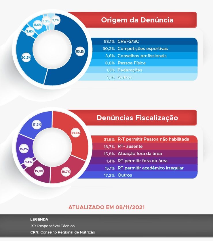 A grande maioria das denúncias éticas são realizadas pelo próprio CREF3/SC, verificadas em fiscalizações, como Responsável Técnico permitindo a atuação de pessoa não habilitada ou ausente do estabelecimento. Outras denúncias vêm regularmente de competições esportivas, Conselhos, Pessoas Físicas, entre outros.