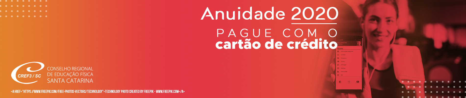 A partir de agora, os profissionais de Educação Física podem pagar a anuidade por meio de cartão de crédito nas bandeiras Visa, Mastercard, ELO e Hipercard. A facilidade está disponível no APP do CREF3/SC, utilizando uma plataforma virtual segura e ágil. Baixe agora o APP e aproveite para parcelar em até 12 vezes anuidades vencidas ou em parcela única a anuidade 2020. Aproveite o primeiro desconto da anuidade até o dia 13 de abril (a data foi alterada em função do dia 10/04 ser feriado).