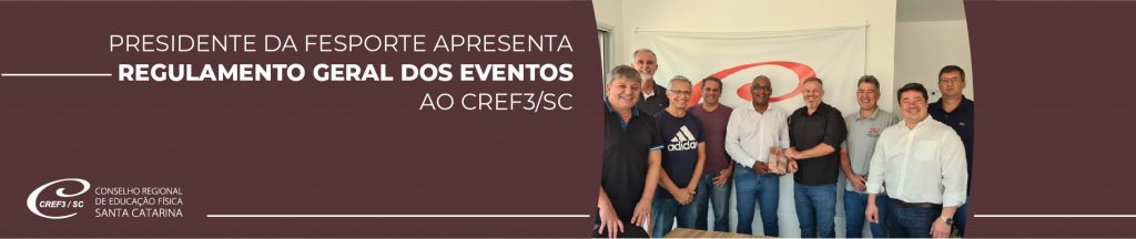 Na última sexta-feira, 4 de março, o presidente da Fesporte, Kelvin Soares (CREF 002004-G/SC), apresentou o Regulamento Geral dos Eventos 2022, e a exigência do registro profissional em modalidades que fazem parte do calendário da Fesporte. A reunião foi realizada na sede do CREF3/SC e contou com a presença do presidente Emerson Brancher (CREF 001925-G/SC), do 1° vice-presidente, Delmar Alberto Tôndolo (CREF 001085-G/SC), do 2º vice-presidente, Juliano Prá (CREF 000258-G/SC), do 1º secretário, José Acco Junior (CREF 003343-G/SC), do 1º tesoureiro, Darcio de Saules (CREF 000170-G/SC), do 2º tesoureiro, Luiz Claudio Cardoso (CREF 000743-G/SC), do assessor jurídico do CREF3/SC, Saulo Yassumassa Ito, e do secretário geral do CREF3/SC, Jean Carlo Leutprecht (CREF 000012-G/SC).
