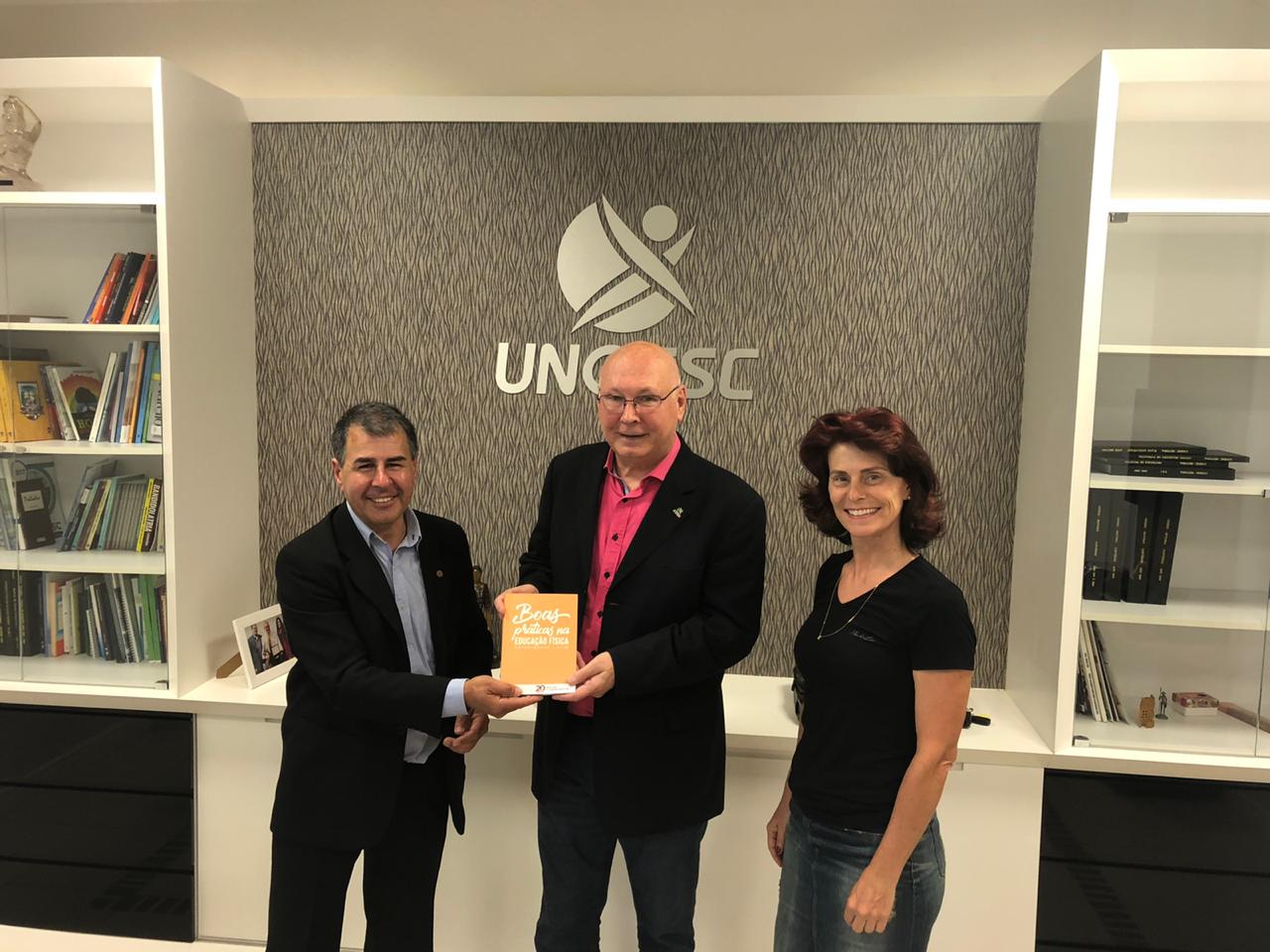 Na oportunidade, Irineu, acompanhado da prof. Elisabeth Baretta (CREF 000330-G/SC), coordenadora do curso de educação física da Unoesc e do prof. Rudy Nodari Júnior (CREF 000321-G/SC), entregou ao reitor um livro de “Boas Práticas na Educação Física Catarinense”.