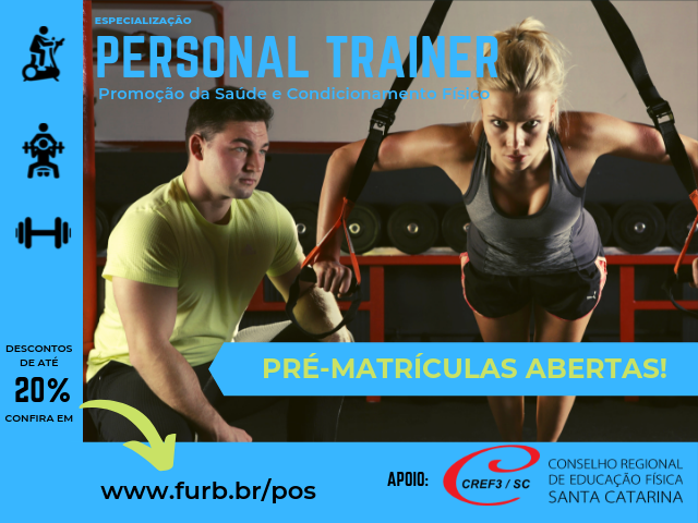 Em busca de expertise para atuar como Personal Trainer, com foco na saúde e no novo ritmo de vida da sociedade? A FURB está com inscrições abertas para a Pós-graduação em nível de Especialização em Personal Trainer – Promoção da Saúde e do Condicionamento Físico, que conta com apoio do CREF3/SC e oferece 15% de desconto aos profissionais regularmente registrados no Conselho. As inscrições podem ser feitas aqui e as aulas começam no dia 7 de fevereiro.