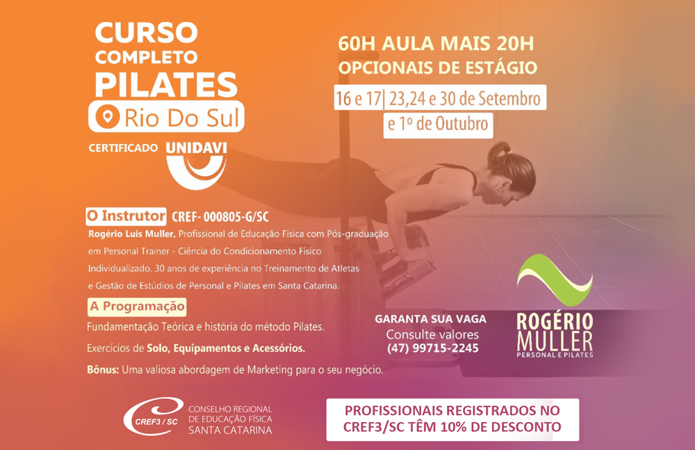 O profissional de Educação Física Rogério Muller (CREF 000805-G/SC) promove curso de Pilates em Rio do Sul, nos dias 16 e 17 e 23, 24 e 30 de setembro. Com fundamentação teórica e histórica do método Pilates, exercícios de solo, equipamentos e acessórios, o curso conta com 60 horas aula e mais 20h de estágio opcional e tem certificado emitido pela Unidavi. Os profissionais de Educação Física registrados no CREF3/SC têm 10% de desconto para a inscrição. Saiba mais detalhes sobre vagas e consulta de valores no telefone (47) 99715 2245.
