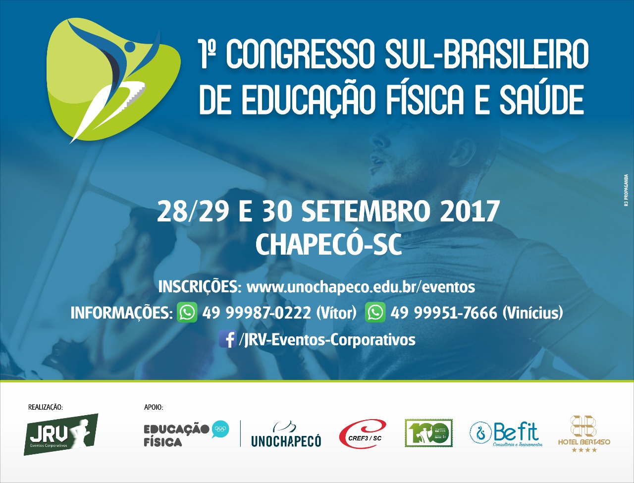 Entre os dias 28 e 30 de setembro, Chapecó receberá o I Congresso Sul-brasileiro de Educação Física e Saúde, que contará com profissionais de São Paulo, Paraná, Santa Catarina e Rio Grande do Sul para ministrar cursos nas áreas de Musculação, Pilates, Recreação Escolar, Personal Training, Ritmos Misturados e Gestão de Academias. O evento, que será realizado na Unochapecó, é voltado para acadêmicos, profissionais de Educação Física e gestores de negócios da área do fitness, numa oportunidade de qualificação, atualização e aperfeiçoamento. Profissionais de Educação Física registrados no CREF3/SC têm descontos para a inscrição, que pode ser realizadas aqui.