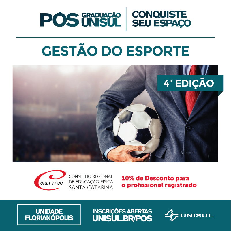 Estão abertas as inscrições para o curso de Pós-graduação em Gestão do Esporte da Unisul, que tem como objetivo desenvolver competências e habilidades intelectuais, cognitivas, humanas e técnicas para o profissional elaborar e coordenar projetos esportivos, gerenciar clubes, academias e demais instalações esportivas, bem como desenvolver soluções e estratégias inovadoras. Os profissionais registrados no CREF3/SC têm 10% de desconto no curso, conforme parceria firmada com a instituição. As inscrições podem ser realizadas aqui.