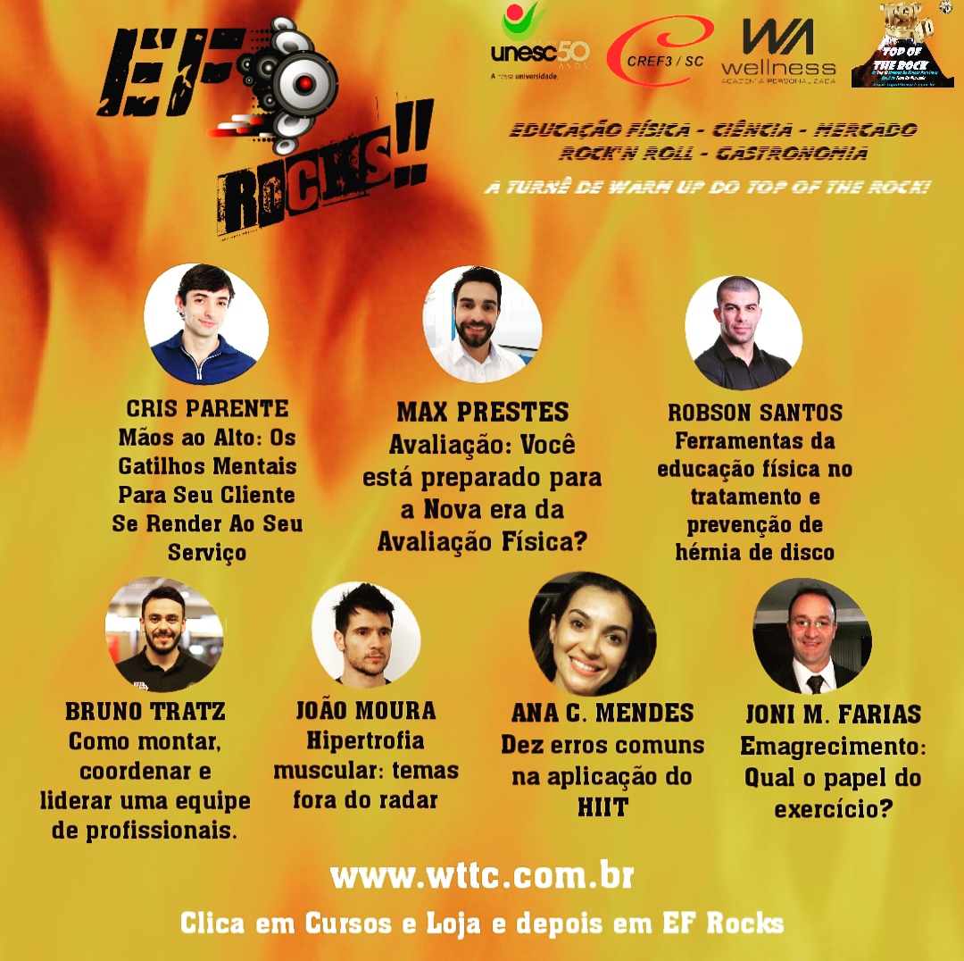 Educação Física, ciência, inovação, música e gastronomia estarão juntos no Congresso EF Rocks, que será realizado na Unesc, em Criciúma, no dia 18 de maio, com apoio do CREF3/SC. O evento faz parte da turnê de aquecimento do Top of the Rock, um dos mais conceituados eventos do setor no país. Profissionais de Educação Física registrados no CREF3/SC têm desconto especial para a inscrição: basta usar o cupom EFROCKSCREF aqui e a inscrição será R$149,00 (leve a Cédula de Identidade Profissional no dia do evento para comprovar o registro). Para acadêmicos, o valor é R$ 99,00, com o cupom EFROCKS50.