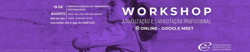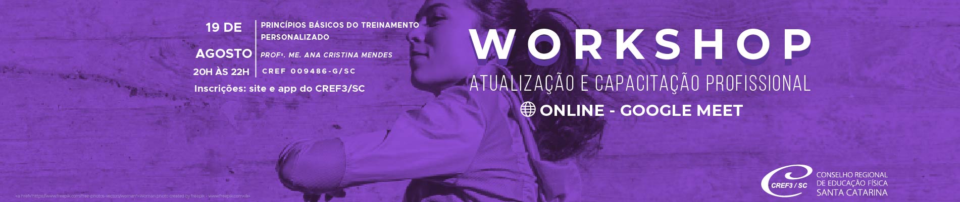 Venha ampliar seus conhecimentos sobre os Princípios básicos do treinamento personalizado no Workshop de Atualização Online, que acontece no dia 19 de agosto, ministrado pela Profa. Me Ana Cristina Mendes (CREF 009486-G/SC), das 20h às 22h, na Plataforma Google Meet.