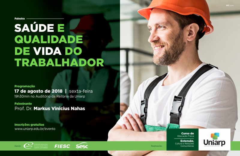 Site-NoticiauniarpA UNIARP, por meio do curso de Educação Física, realiza dia 17 de agosto a palestra: Saúde e Qualidade de vida do trabalhador. O evento conta com apoio da FIESC, SESC e Conselho Regional de Educação Física de Santa Catarina (CREF3/SC). A palestra será ministrada pelo professor Markus Vinicius Nahas (CREF 000150-G/SC) , doutor em Educação Física e criador do Pentáculo do Bem-Estar, que representa os cinco componentes que influenciam na qualidade de vida do indivíduo. As inscrições são gratuitas no site: www.uniarp.edu.br/evento.