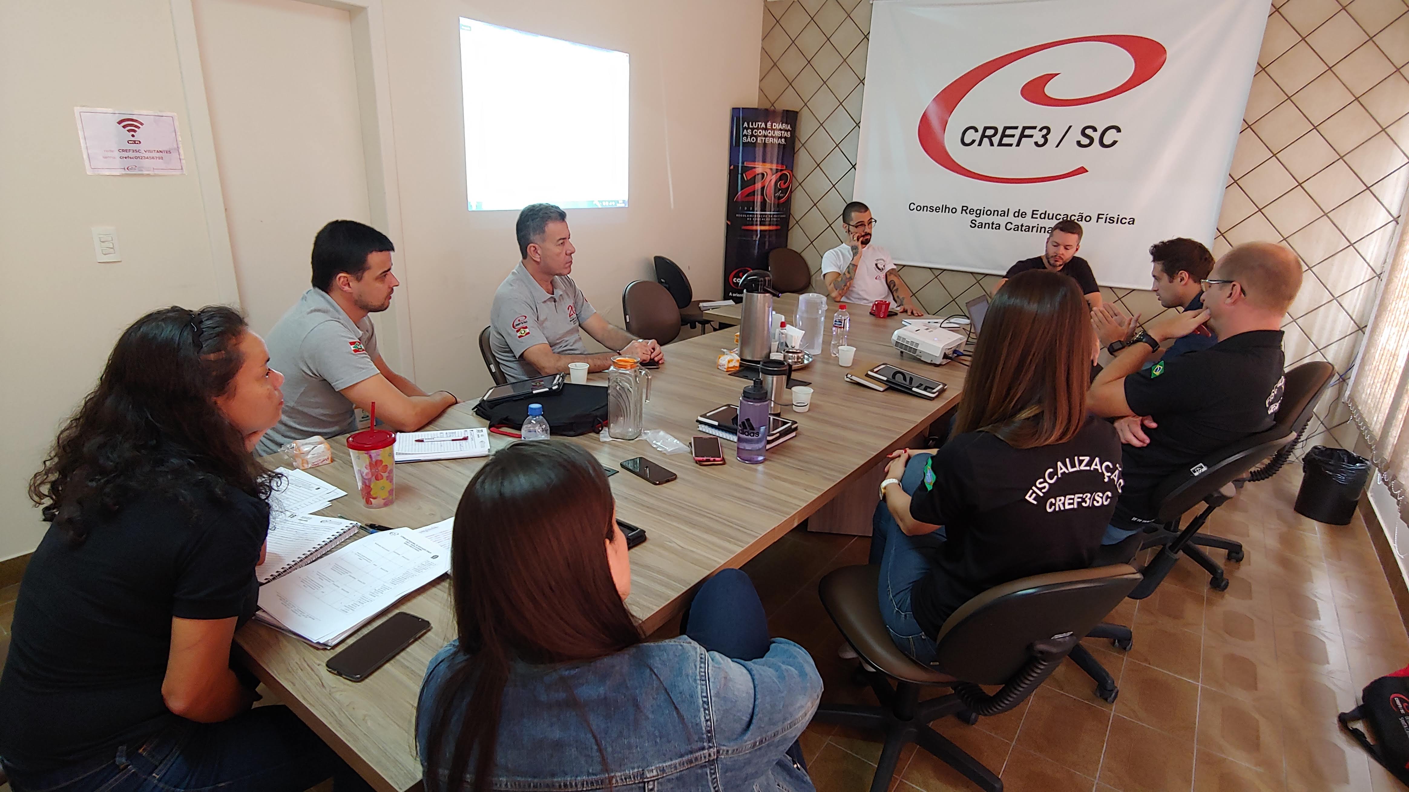 A apresentação do novo plano de ação do setor de Orientação e Fiscalização profissional reuniu o setor em três dias de treinamento, entre os dias 18 e 20 de março, na sede do CREF3/SC, para alinhar informações e definir propostas de melhorias para a atuação. Também foram realizados o aperfeiçoamento técnico e o treinamento do novo agente de orientação e Fiscalização, Fernando Mutschall (CREF 015034-G/SC), que atuará na região de Joinville.