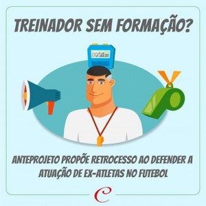Está em tramitação na Câmara dos Deputados um anteprojeto de Lei (Relatório 5/2017) que reforma a Lei Pelé e o Estatuto do Torcedor. A proposta, analisada pela Comissão Especial de Reformulação da Legislação do Esporte, propõe um retrocesso ao atribuir a indivíduos sem formação superior a condição de Treinador de Futebol. Pretende-se, deste modo, permitir que ex-jogadores sem o devido conhecimento científico, biológico, pedagógico e ético, atuem como treinadores de crianças, jovens, mulheres, pessoas com deficiência, entre outros, colocando em risco a saúde desses indivíduos.