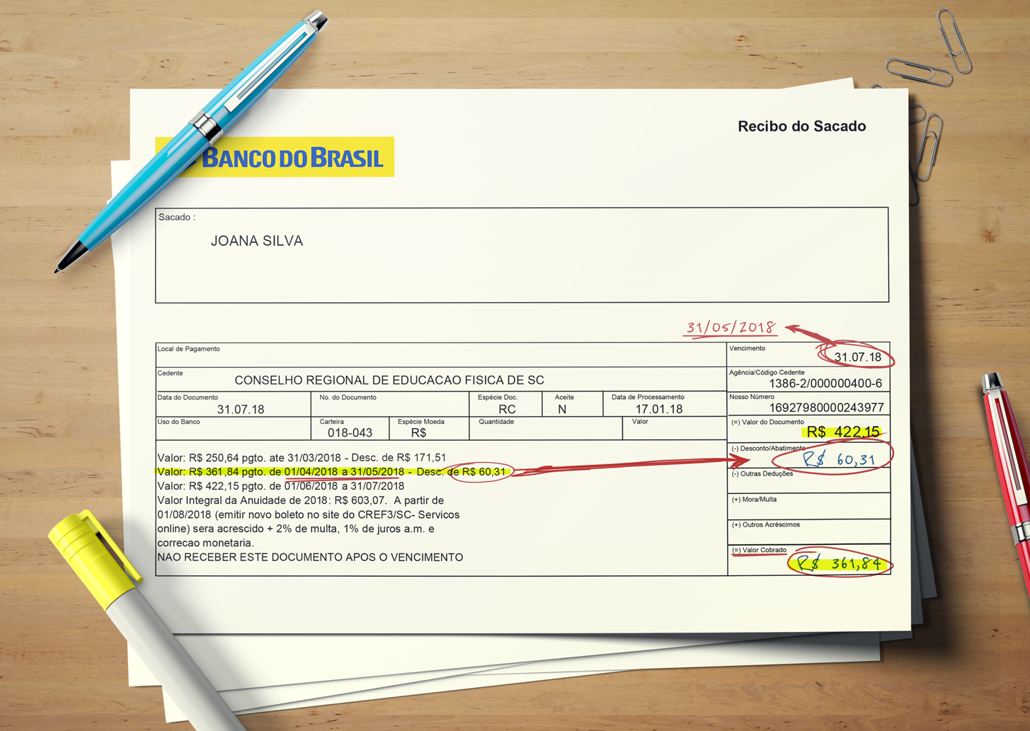 Para pagamento de 01/04/2018 até 31/05/2018 – inserir o valor de R$ 60,31 no campo “Desconto/Abatimento” – valor total a ser pago: R$ 361,84 (desconto de 40%) e alterar a data do vencimento para a data do pagamento do boleto. (clique aqui para ver o modelo boleto com o desconto)