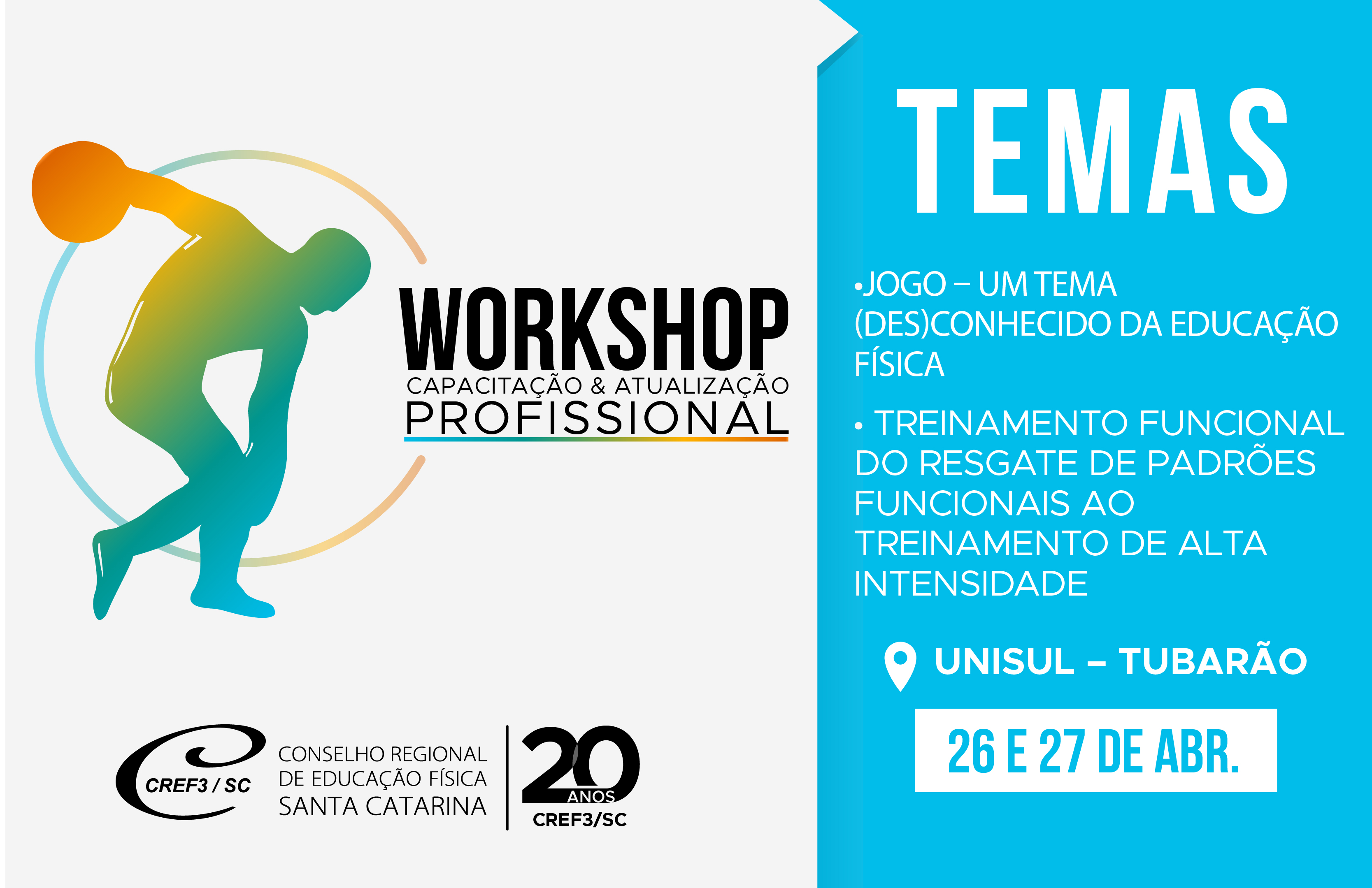 Já fez sua inscrição para o Workshop de Capacitação e Atualização Profissional de Tubarão? O evento acontece nos dias 26 e 27 de abril, na Unisul, com os cursos “Jogo – um tema (des)conhecido da Educação Física”, ministrado pelo prof. Adonis Marcos Lisboa (CREF 002739-G/SC), e “Treinamento Funcional do Resgate de Padrões Funcionais ao Treinamento de Alta Intensidade”, ministrado pelo prof. Hudson Mafra Junior – (CREF 000095-G/SC).
