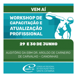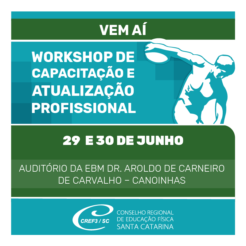 Atenção profissionais de Educação Física de Canoinhas e região: o CREF3/SC realiza o Workshop de Capacitação e Atualização Profissional no auditório da Escola Básica Municipal Dr. Aroldo Carneiro de Carvalho, nos dias 29 e 30 de junho, com apoio da Prefeitura de Canoinhas e Secretaria de Educação. As inscrições são gratuitas para acadêmicos e profissionais de Educação Física. Participe!
