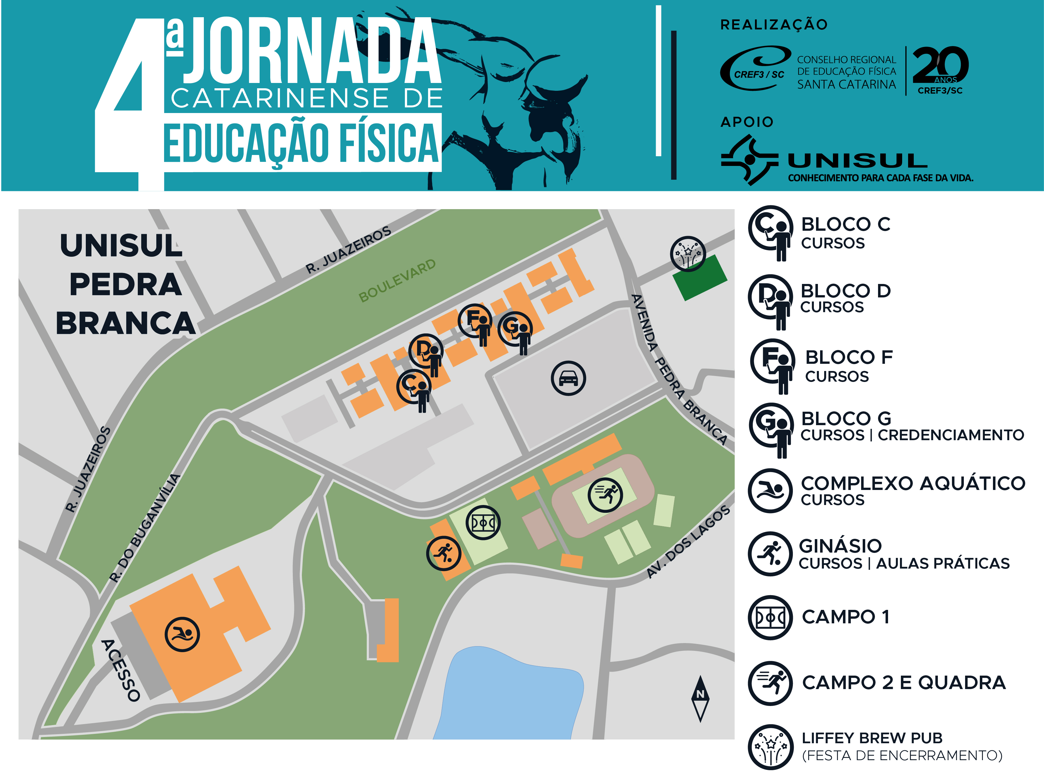 Vem para a 4ª Jornada Catarinense da Educação Física, que acontece nos dias 30 e 31 de agosto na Unisul Pedra Branca, em Palhoça/SC? Confira o mapa ao lado onde serão realizados os cursos de sexta e sábado e toda a infraestrutura disponível para os profissionais de Educação Física participantes do evento.