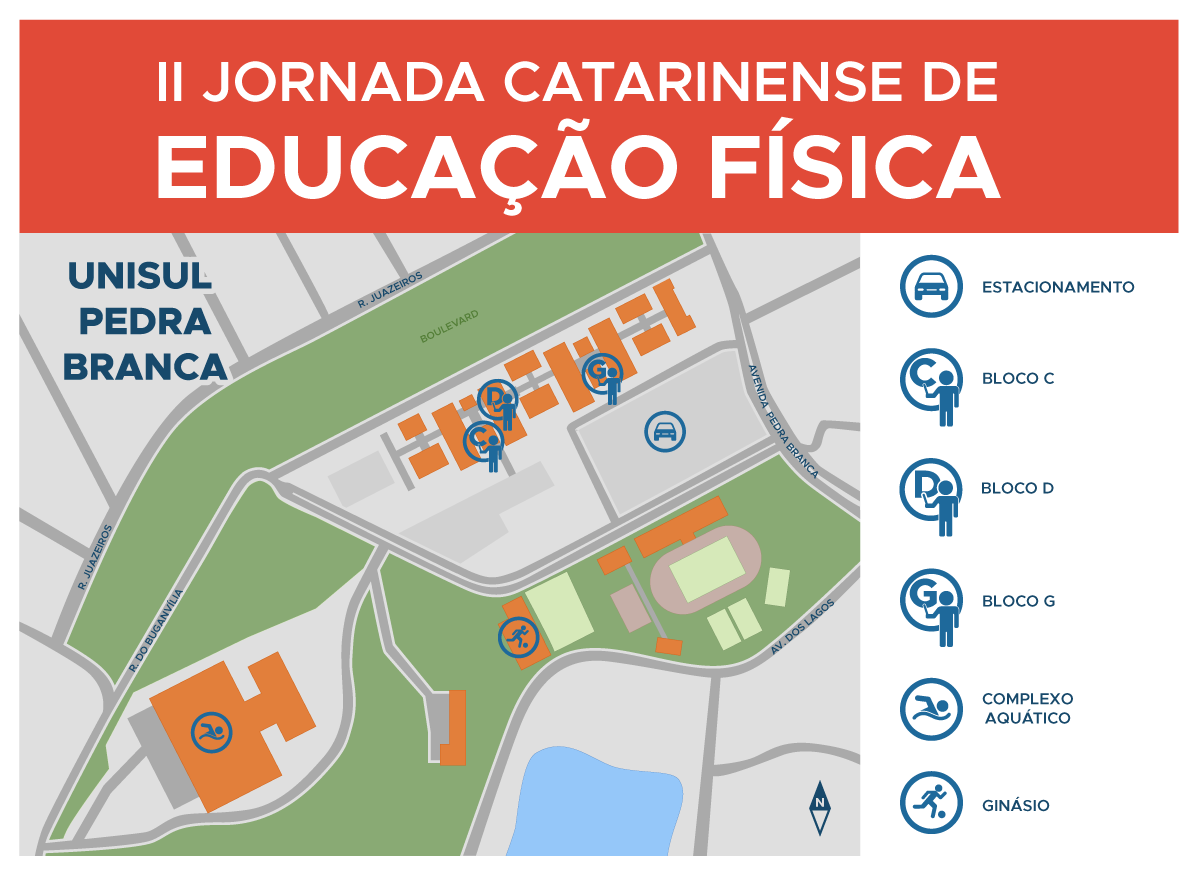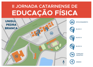 Na próxima sexta-feira, 1º de setembro, começa a II Jornada Catarinense da Educação Física, na Unisul Pedra Branca, em Palhoça/SC. Para quem vem de fora e não conhece muito bem o local, confira o mapa ao lado onde serão realizados os cursos de sexta e sábado e toda a infraestrutura disponível para os profissionais de Educação Física participantes do evento.