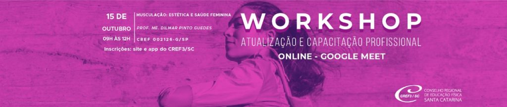 Para conhecer as diferenças anatômicas, fisiológicas e biomecânicas entre os sexos, além da escolha dos exercícios mais eficientes para as preferências femininas, o CREF3/SC realiza o Workshop de Atualização Online “Musculação: estética e saúde feminina”, ministrado Prof. Me. Dilmar Pinto Guedes (CREF 002126-G/SP), no dia 15/10, das 9h às 12h, na Plataforma Google Meet.