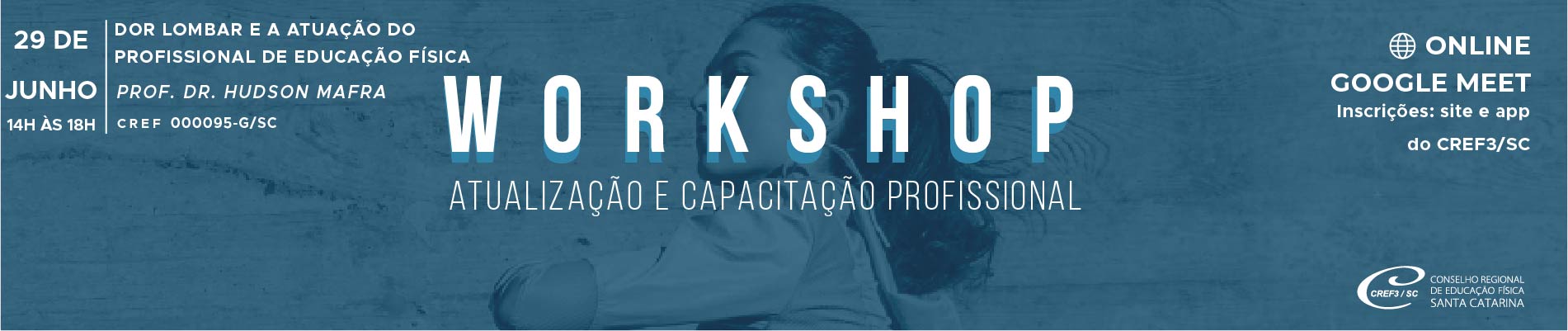 Como o profissional de Educação Física pode atuar na dor lombar? Saiba mais sobre a etiologia da doença, testes, estruturação da sessão de treino e repertório de exercícios específicos no curso “Dor Lombar e a atuação do profissional de Educação Física”, ministrado pelo prof. Dr. Hudson Mafra (CREF 000095-G/SC) no Workshop de Atualização e Capacitação Profissional online, que acontece no dia 29 de junho, na Plataforma Google Meet, das 14h às 18hs.