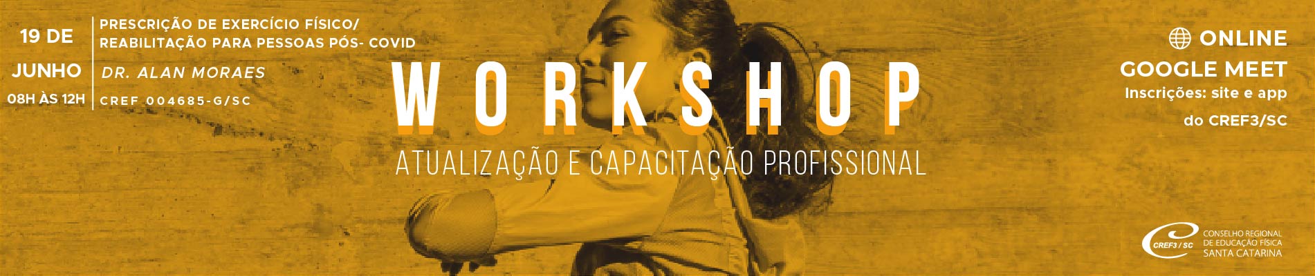 No próximo sábado, 19 de junho, o Workshop de Atualização e Capacitação Profissional online dá continuidade ao curso realizado dia 12, com o tema “Prescrição de exercício físico/reabilitação para pessoas pós-COVID”, ministrado pelo prof. Dr. Alan de Moraes (CREF 004685-G/SC), complementando o assunto de grande relevância para o profissional de Educação Física atualmente. O curso, que será realizado na Plataforma Google Meet, das 8h às 12hs, vai abordar o treinamento físico clínico para pessoas pós-COVID, bem como a resposta do sistema imune ao treinamento físico, com foco na reabilitação.