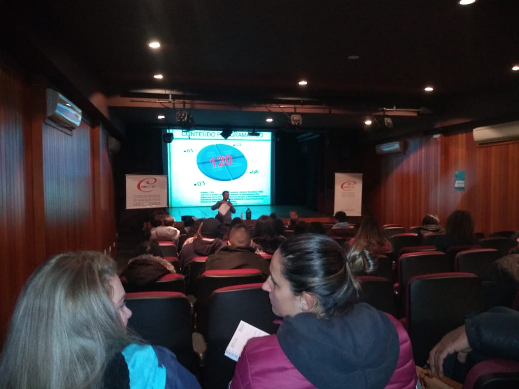 Profissionais e acadêmicos de Educação Física participam agora do curso “A criatividade e Diversidade Lúdica para aulas inclusivas na Educação Básica”, ministrado pelo prof. Me. Roberto Mafli (CREF 001957-G/SC), que abriu na manhã de hoje o Workshop de Capacitação e Atualização Profissional de Lages. O evento se estende até amanhã, 6 de julho, no SESC Lages, com o curso “Biomecânica Aplicada à Musculação”, ministrado pelo prof. Me. Cristiano Gomes Sanchotene (CREF 009054-G/SC).