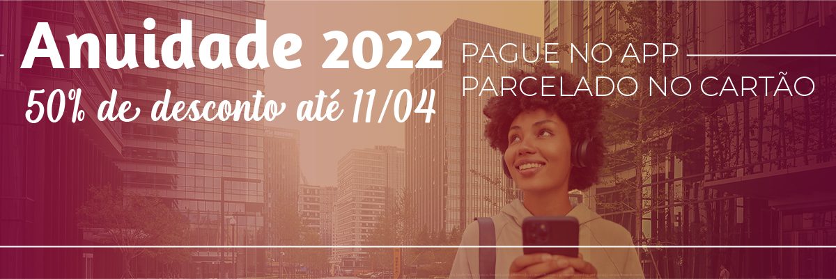 Até o dia 11/04, profissionais podem pagar a anuidade 2022 com 50% de desconto, no valor de R$ 301,54 (com desconto), que pode ser parcelado em até 3x vezes no cartão de crédito.