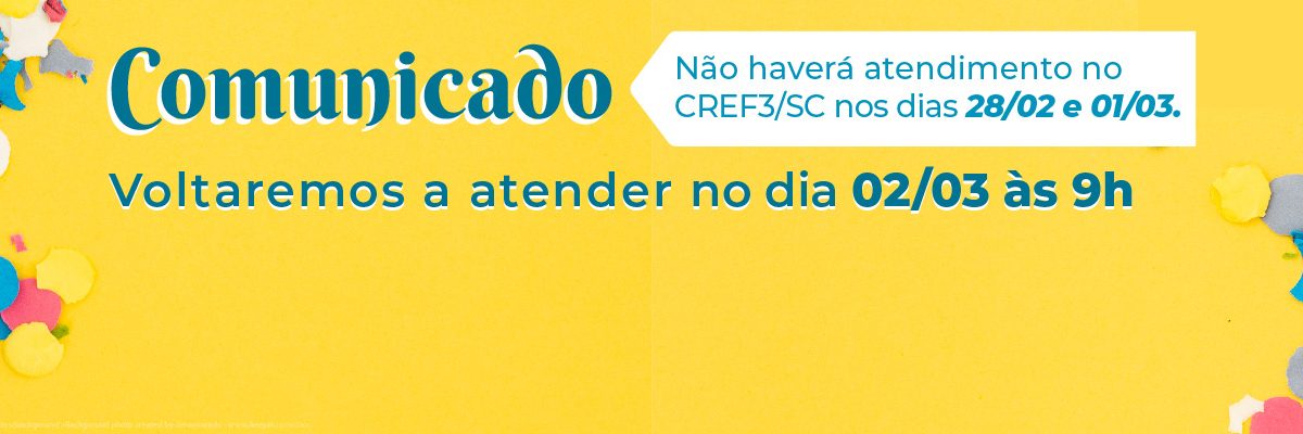 Em razão do feriado de Carnaval, o CREF3/SC estará fechado nos dias 28/02 e 1/03. Na quarta-feira de cinzas, 2 de março, as atividades serão retomadas a partir das 9 horas.