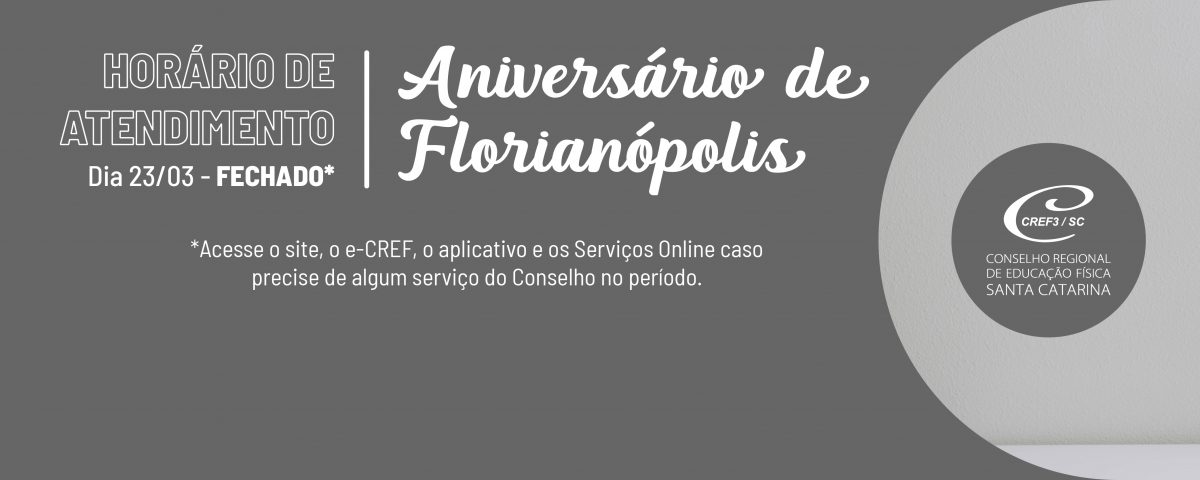 O CREF3/SC estará fechado no dia 23 de março devido ao feriado municipal de aniversário de Florianópolis.