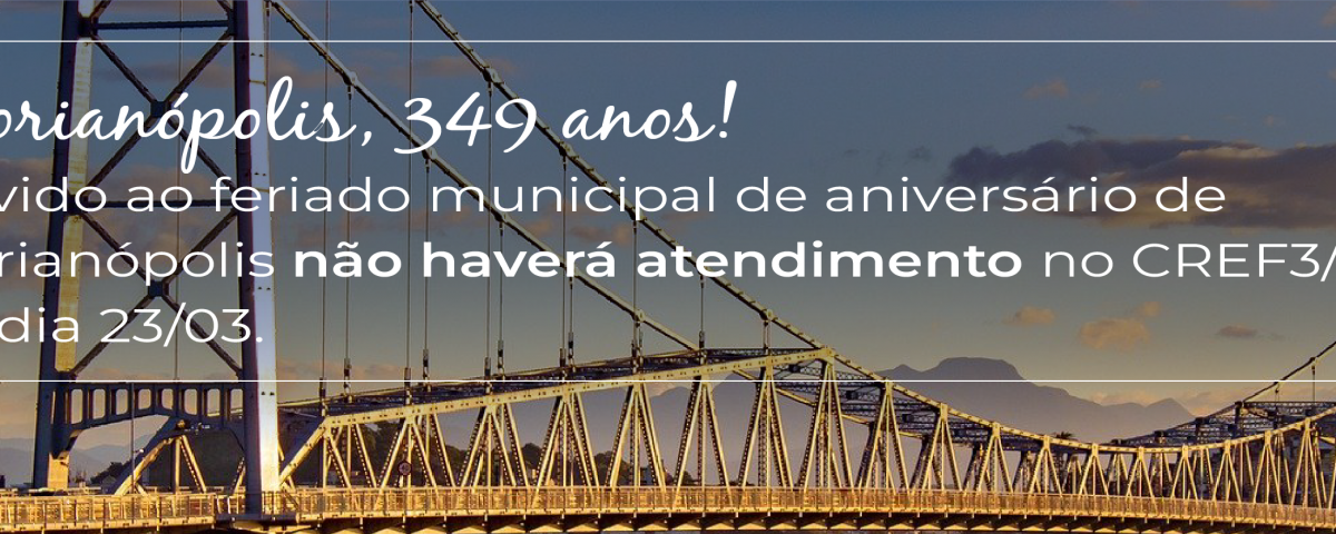 O CREF3/SC estará fechado no dia 23 de março devido ao feriado municipal de aniversário de Florianópolis.