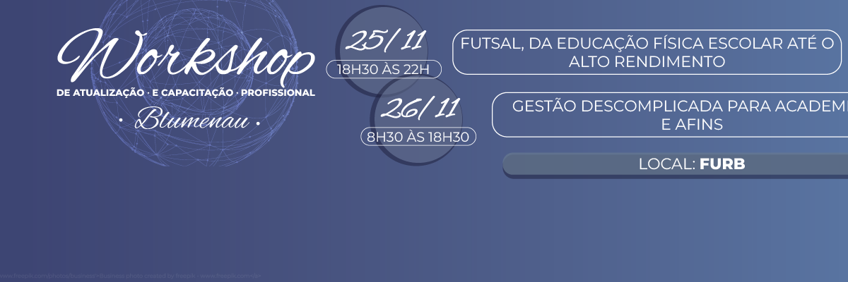 Blumenau encerra a série de Workshops de Capacitação e Atualização Profissional realizados pelo CREF3/SC em 2022, na FURB, dias 25 e 26 de novembro. O evento trará os cursos “Futsal, da Educação Física Escolar até o Alto Rendimento”, com o prof. Me. Marcos Xavier de Andrade (CREF 001717-G/SC) e “Gestão descomplicada para Academias e afins”, ministrado pelo prof. Dr. Rogério Soares (CREF 035464-G/SP), que contará com a participação do prof. esp. Regis Soares (CREF 000009-G/SC), que trará informação sobre Responsabilidade Técnica de estabelecimentos que prestam serviços de atividade física.