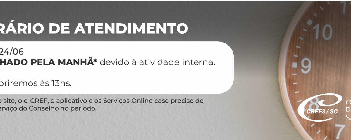 Em razão de uma atividade interna, não haverá atendimento externo no período matutino da próxima sexta-feira, 24/06. O atendimento ao profissional na sede do CREF3/SC iniciará às 13h.