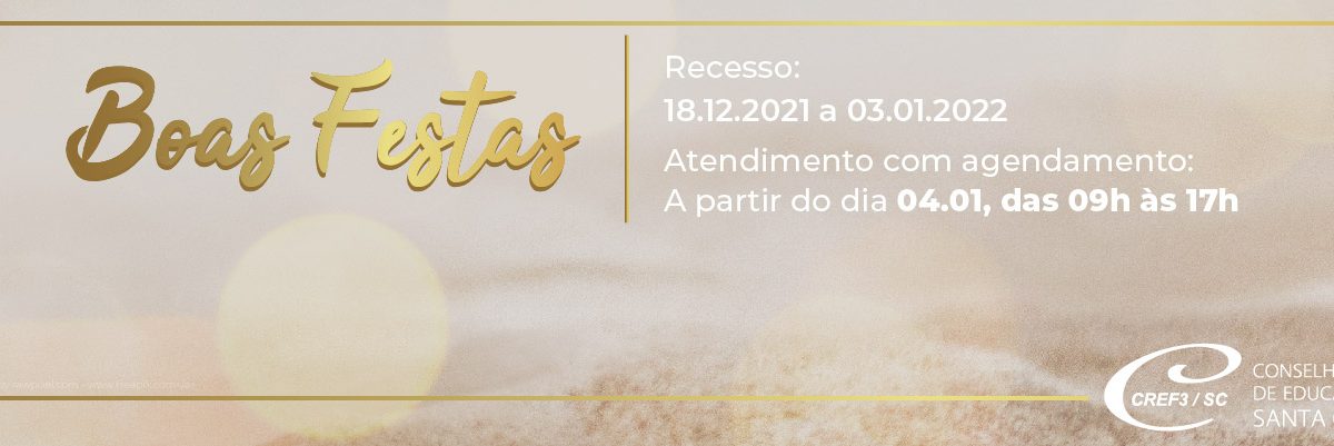 Atenção profissionais de Educação Física: devido ao período de recesso de final de ano, o CREF3/SC estará fechado entre os dias 18 de dezembro e 3 de janeiro de 2022. O atendimento externo será retomado no dia 4 de janeiro, com atendimento agendado via whatsapp (48 3348-7007), das 9h às 16hs.