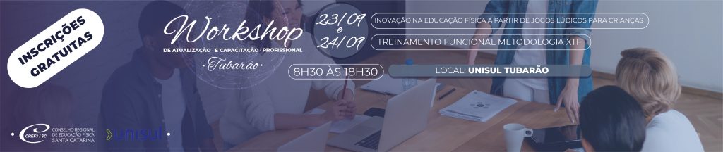 Rumo ao sul do Estado, o CREF3/SC realiza o Workshop de Capacitação e Atualização Profissional na Unisul, em Tubarão, nos dias 23 e 24 de setembro. O evento trará os cursos “Inovação na Educação Física a partir de jogos Lúdicos para Crianças”, ministrado pelo prof. Me. Roberto Mafli (CREF 001957-G/SC) e “Treinamento funcional Metodologia XTF”, com o Prof. Esp. Rafael Mafra (CREF 008830 G/SC).