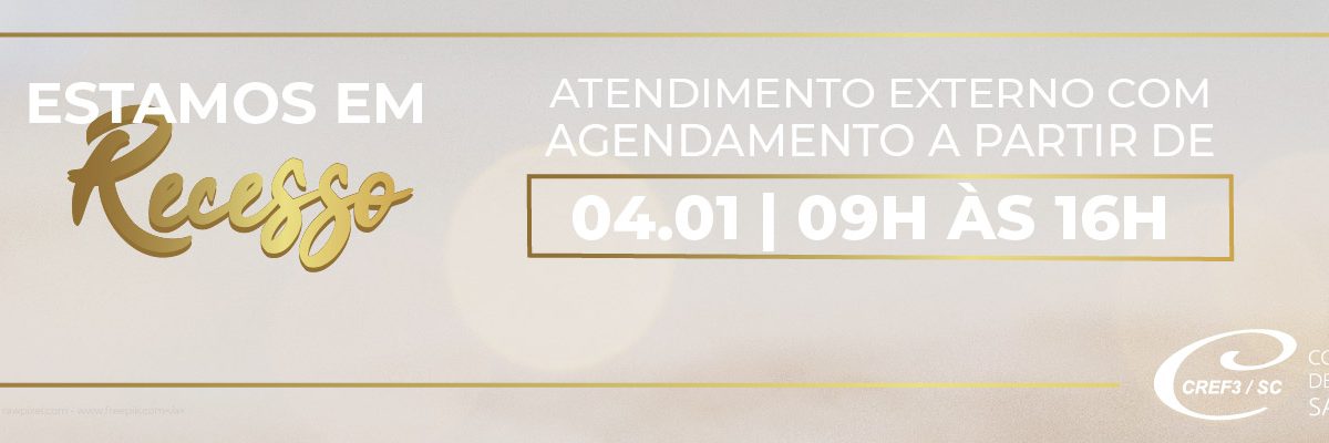 Devido ao período de recesso, o CREF3/SC estará fechado até o dia 4 de janeiro de 2022. O atendimento externo será retomado no dia 4 de janeiro, com atendimento agendado via whatsapp (48 3348-7007), das 9h às 16hs.