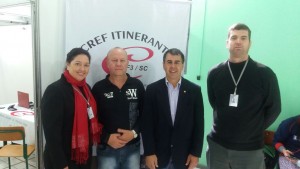 O profissional Airto Valadares (CREF 000714-G/SC) foi o primeiro a ser atendido e manifestou seu contentamento e alegria em ver o Conselho no interior de Santa Catarina oferecendo todo26s os serviços como se o atendimento fosse na sede, em Florianópolis. O profissional reside em Chapecó e foi para São Miguel do Oeste para ser atendido. Na foto, o profissional atendido juntamente com o presidente do CREF Irineu Furtado (CREF 003767-G/SC) e os funcionários Robson Nunes e Raquel Mattos.