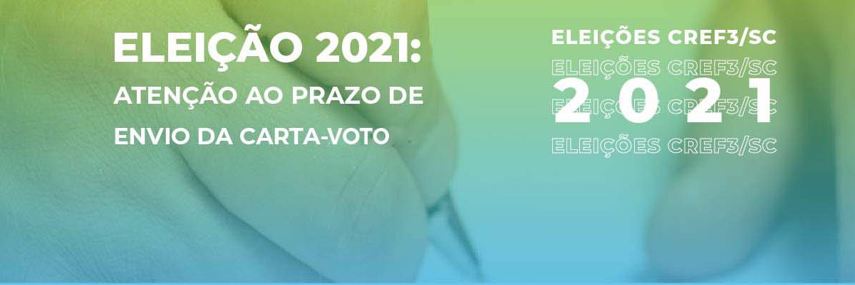 O profissional de Educação Física que optar pelo voto por correspondência na Eleição 2021 deve ficar atento ao prazo de envio da carta-voto nos Correios para a Caixa Postal do CREF3/SC. Somente serão computados os votos por correspondência que forem recebidos na caixa postal indicada até às 15h do dia 1º de outubro de 2021, cabendo a cada profissional remetê-lo com a antecedência devida. De acordo com o Regimento Eleitoral, os votos que chegarem após o prazo serão aceitos para fins de justificativa do não exercício do direito ao voto, contudo, sem serem contabilizados.