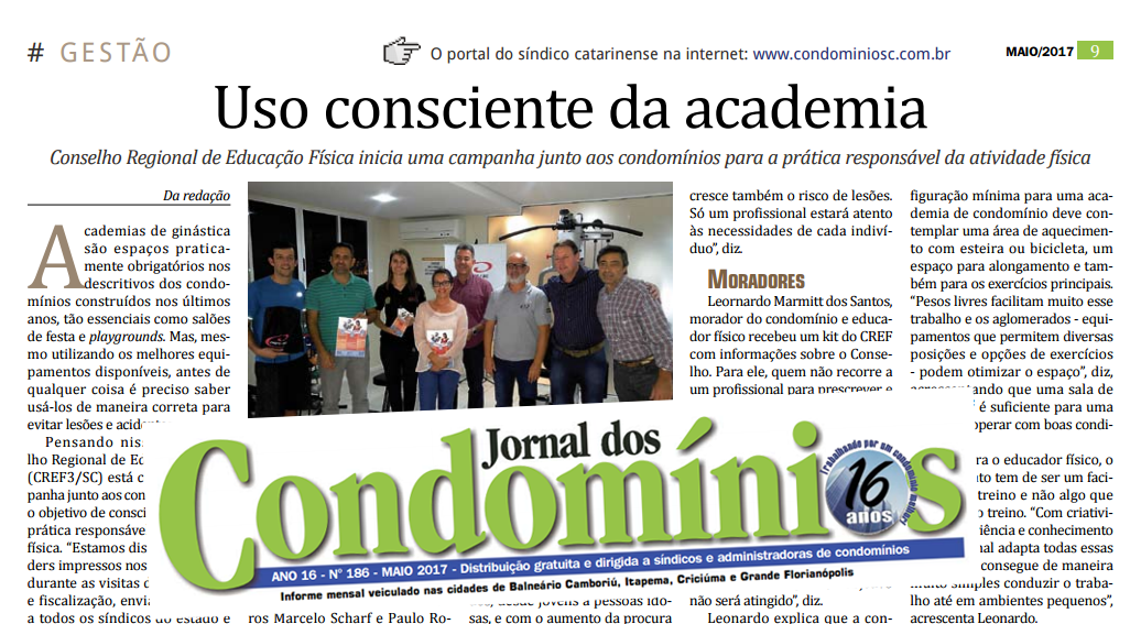Jornal destaca campanha de orientação para usuários de academias em condomínios - CREF3/SC - Conselho Regional de Educação Física de SC