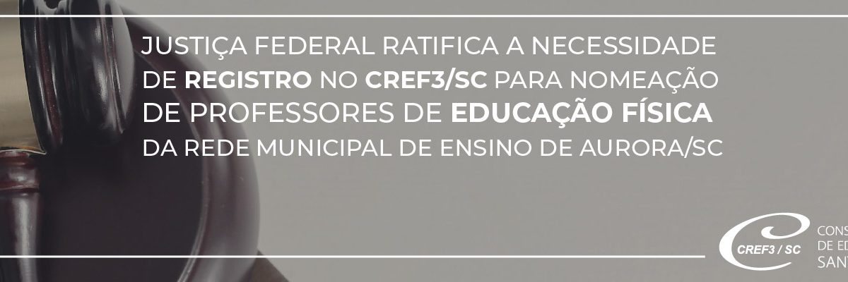 O Juízo Substituto da 1ª VF de Rio do Sul decidiu, em tutela de urgência, que a prefeitura de Aurora não nomeie ou dê posse aos candidatos aprovados no Processo Seletivo nº 01/2021 para o cargo de Professor de Educação Física do Ensino Básico municipal – ainda que se trate de Ensino Fundamental – que não estejam devidamente habilitados, ou seja, não tenham o respectivo grau de Licenciatura em Educação Física, com registro no CREF3/SC. A decisão foi tomada no dia 19/01/2022, após Ação Civil Pública ajuizada pelo CREF3/SC, para que fosse observado o disposto na Lei nº 9.696/1998, impedindo o exercício do magistério de Educação Física por professores sem o registro profissional no Sistema CONFEF/CREFs e também a contratação de não habilitados.