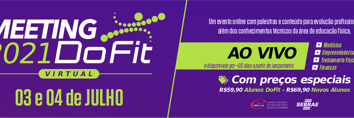 Banner siteA DoFit, em parceria com o CREF3/SC, sorteará 10 inscrições para profissionais registrados no CREF3/SC para participar do Meeting DoFit 2021, que acontecerá nos dias 03 e 04 de julho, de forma 100% virtual. Para participar do sorteio, basta preencher o formulário e acompanhar o Instagram @DoFitBR, onde será divulgado o resultado no dia 24 de junho.
