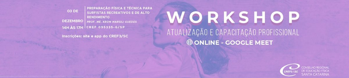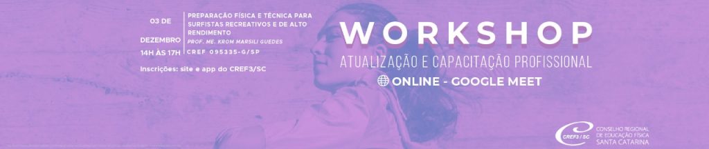O cenário do surfe competitivo mudou muito aos longo dos últimos anos. Quais as principais discussões científicas do ponto de vista do treinamento físico? Como aproveitar esse nicho dentro de academias e estúdios ou trabalhando como Personal Trainer? Venha saber mais sobre o assunto no curso “Preparação Física e técnica para surfistas recreativos e de alto rendimento”, que será ministrado Prof. Me. Krom Marsili Guedes (CREF 095335-G/SP), no Workshop de Atualização Online, dia 3/12, das 14h às 17h, na Plataforma Google Meet.