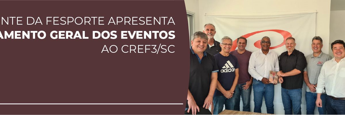 Na última sexta-feira, 4 de março, o presidente da Fesporte, Kelvin Soares (CREF 002004-G/SC), apresentou o Regulamento Geral dos Eventos 2022, e a exigência do registro profissional em modalidades que fazem parte do calendário da Fesporte. A reunião foi realizada na sede do CREF3/SC e contou com a presença do presidente Emerson Brancher (CREF 001925-G/SC), do 1° vice-presidente, Delmar Alberto Tôndolo (CREF 001085-G/SC), do 2º vice-presidente, Juliano Prá (CREF 000258-G/SC), do 1º secretário, José Acco Junior (CREF 003343-G/SC), do 1º tesoureiro, Darcio de Saules (CREF 000170-G/SC), do 2º tesoureiro, Luiz Claudio Cardoso (CREF 000743-G/SC), do assessor jurídico do CREF3/SC, Saulo Yassumassa Ito, e do secretário geral do CREF3/SC, Jean Carlo Leutprecht (CREF 000012-G/SC).