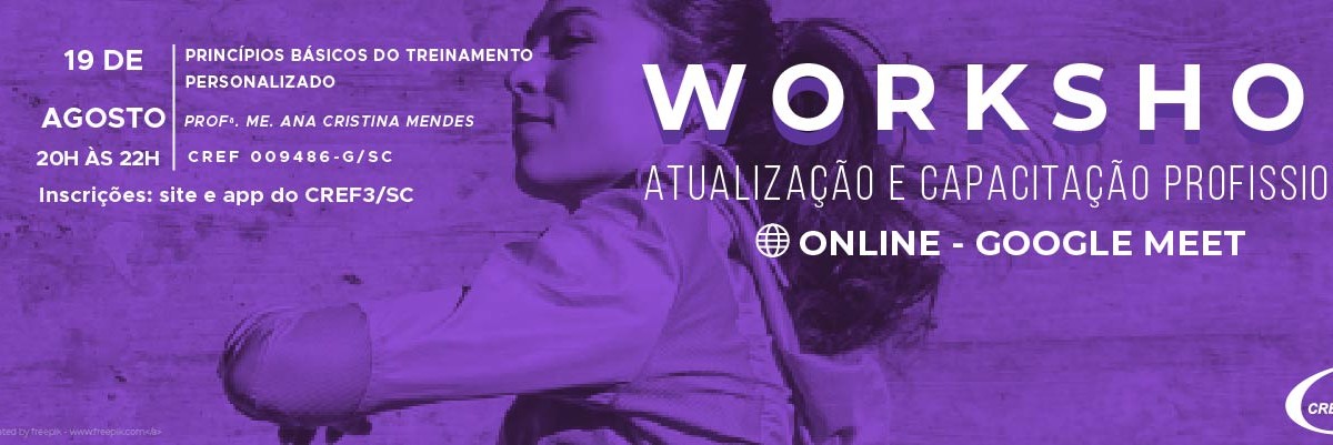 Venha ampliar seus conhecimentos sobre os Princípios básicos do treinamento personalizado no Workshop de Atualização Online, que acontece no dia 19 de agosto, ministrado pela Profa. Me Ana Cristina Mendes (CREF 009486-G/SC), das 20h às 22h, na Plataforma Google Meet.