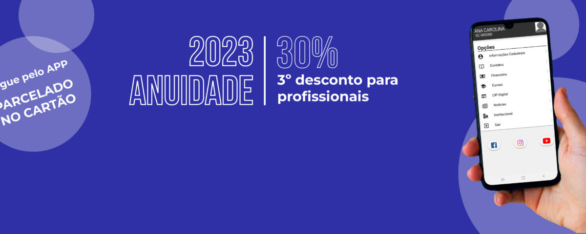Ainda dá tempo de aproveitar os descontos da Anuidade 2023. Até o dia 12/06/2023, o valor para profissionais é de R$ 422,15, com 30% de desconto. O boleto está disponível nas plataformas digitais do CREF3/SC (Serviços Online e APP). O desconto é válido SOMENTE para profissionais e empresas registradas até 31/12/22, de acordo com a Resolução n° 0225/2022/CREF3/SC.